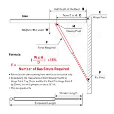 While finding a gas strut to replace an old one can be a straightforward process, determining the correct size and weight capacity for the first time can be more challenging. However, there is a formula available that, while initially appearing complex, is manageable if you have accurate measurements. However, this formula acts as a guide online. Our team can help you to determine the correct gas strut if you provide us with accurate information. Alternatively, you can use the provided formula below to calculate the required specifications yourself.